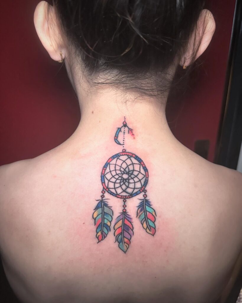 This bright dreamcatcher tattoo starts at the nape of the neck and cascades down the upper back. The feathers are inked in multiple colors—blue, green, and red—making the design playful and vibrant.