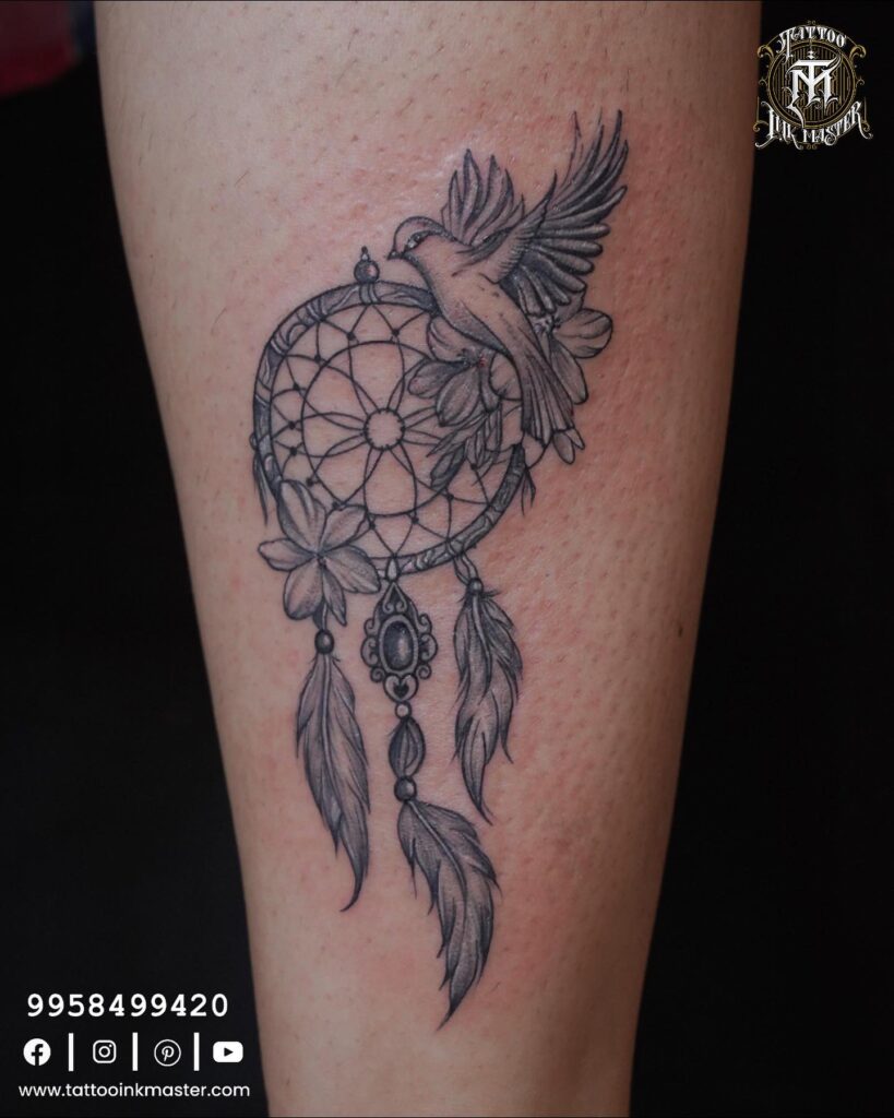 Leg tattoos like this allow enough space for intricate shading and storytelling. The bird adds motion and a sense of liberation, while the dreamcatcher grounds the piece with protection and harmony.