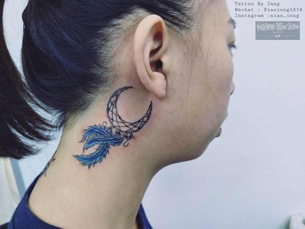 7. Behind-the-Ear Crescent Dreamcatcher Tattoo