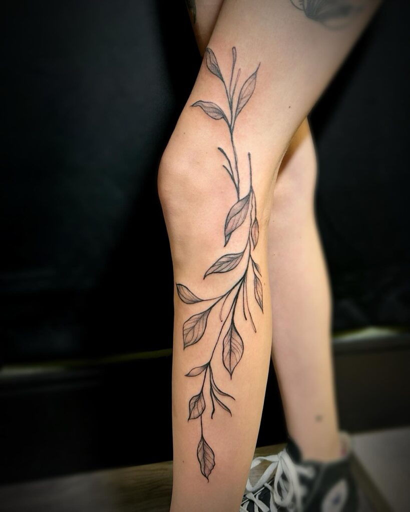 Running along the leg, this tattoo showcases a delicate branch with long, narrow leaves, flowing naturally as though caught in a gentle breeze. The thin lines and soft shading bring movement and lightness, making the design both elegant and minimalistic. Its placement enhances the vertical lines of the body, emphasizing grace and balance.