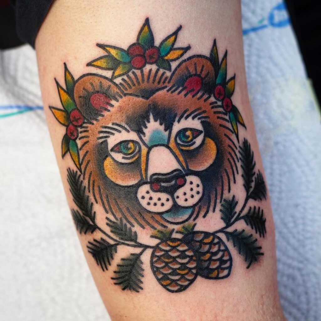 A bold, colorful tattoo featuring a bear’s face surrounded by pine branches, cones, and berry accents. Its traditional style shading and vibrant hues give it strength and character, making it stand out as a timeless nature-inspired piece. Bears symbolize courage, grounding, and protection, while the surrounding foliage emphasizes harmony with the forest.