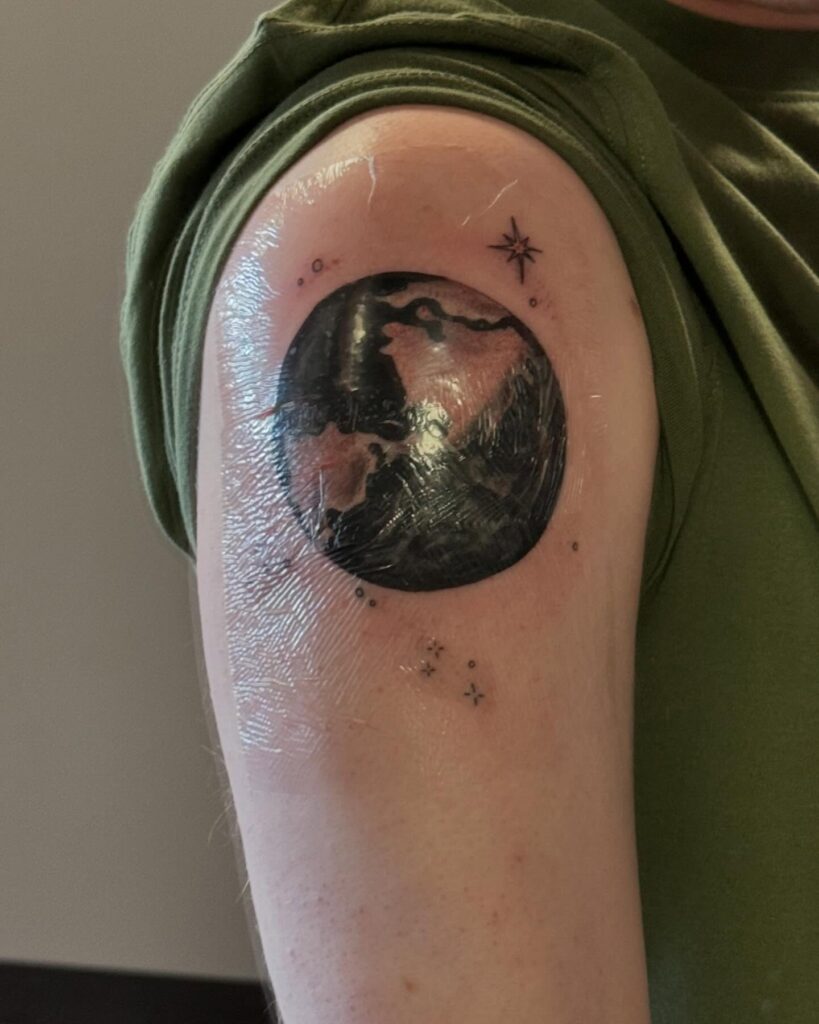 This tattoo places Earth at the center, framed by delicate stars and cosmic details around the upper arm. The circular shape gives it a planetary glow, while the shading captures depth and dimension of the continents.
