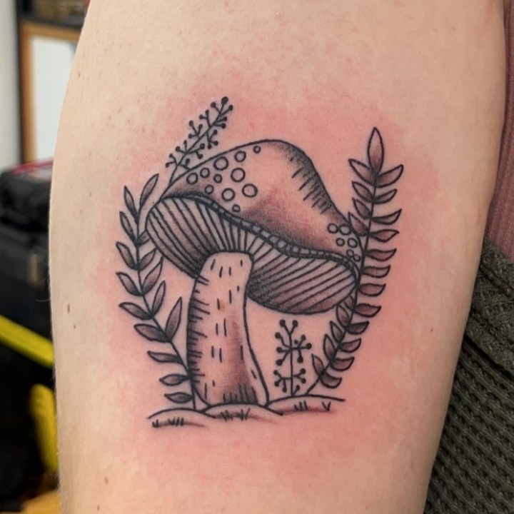This tattoo features a single large mushroom, framed by delicate branches and fern-like details. The shading and dotwork create texture, making the cap appear both whimsical and natural. Mushrooms symbolize transformation, mystery, and the unseen connections of life beneath the soil.