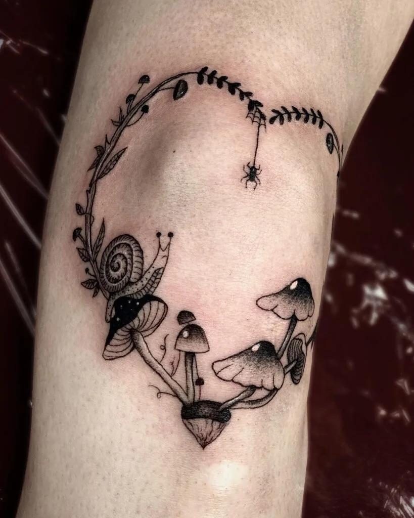 Whimsical and enchanting, this tattoo forms a natural wreath encircling the knee, created from mushrooms, vines, a snail, and even a tiny spider hanging from a web. The playful details capture the essence of woodland magic, where every creature and plant has its role in the ecosystem.