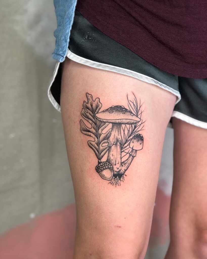 This tattoo illustrates a collection of forest elements, including mushrooms, oak leaves, and acorns, layered together in a natural arrangement. The intricate linework and dot shading bring out textures, creating a realistic yet artistic depiction of the forest floor.