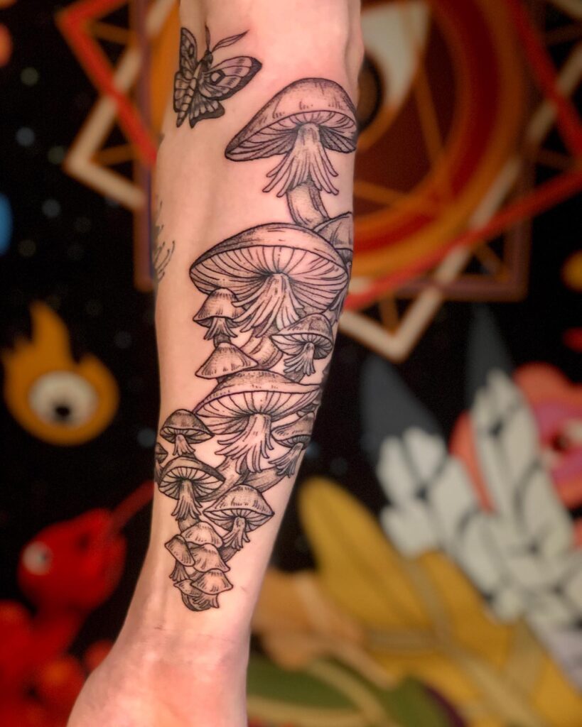 This forearm tattoo showcases a cluster of mushrooms growing in a cascading flow, detailed with fine linework and delicate shading. Their upward and downward movement creates a sense of natural growth, almost like an organic waterfall.