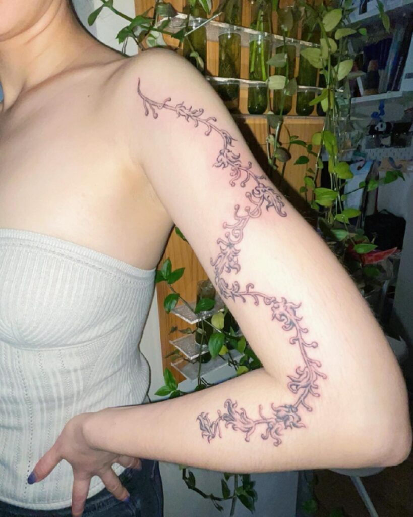 Wrapping gracefully around the arm, this vine tattoo mimics the natural curl and spread of living plants. Its delicate leaves extend in an elegant pattern, creating the impression of something alive and climbing.