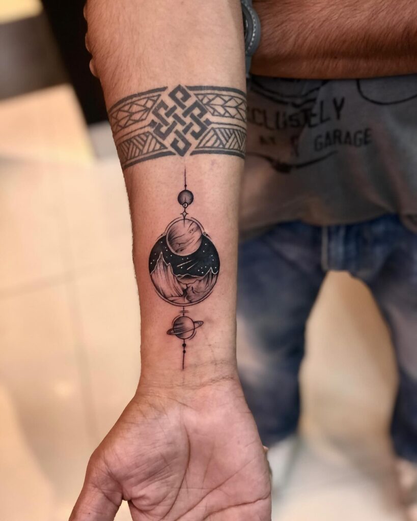 This tattoo combines cosmic imagery with earthly grounding, depicting planets aligned vertically with a central orb that holds a mountain and night sky scene. Saturn’s rings below and lunar details above enhance its cosmic alignment. Its placement on the forearm makes it a bold yet elegant piece, balancing celestial wonder with earthly landscapes.