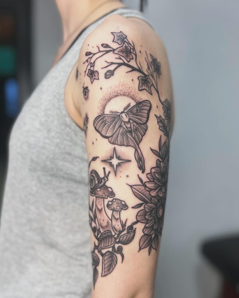 This half-sleeve tattoo tells a story of nocturnal magic, featuring a luminous moth surrounded by stars, mushrooms, flowers, and vines. The detailed shading brings depth, making the composition feel alive and enchanting. Snails and small natural accents add charm, while the central moth symbolizes transformation and guidance through darkness.