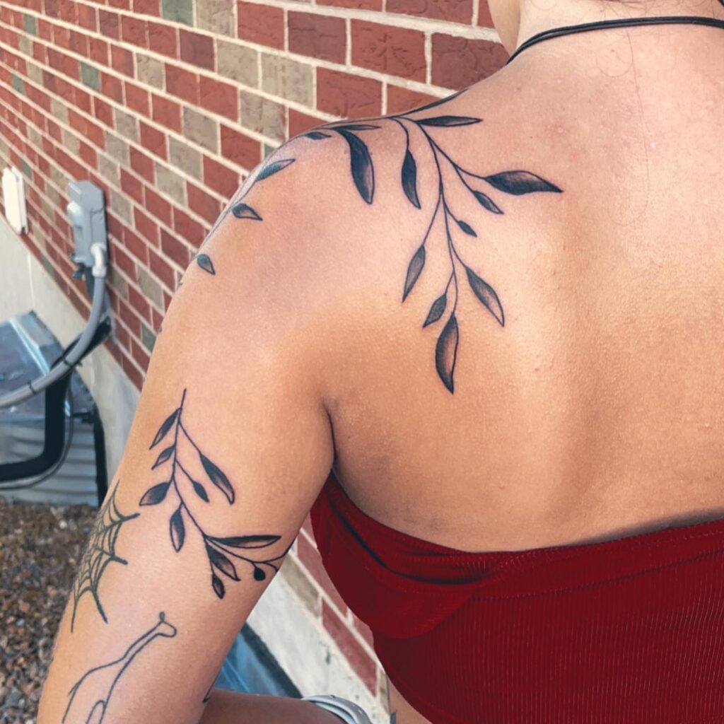 Flowing across the shoulder and upper arm, this tattoo depicts branches with slender leaves, designed to follow the body’s natural curves. The placement gives it an organic, wearable effect, almost like nature’s jewelry draped across the skin. The shading gives dimension, making each leaf look alive and dynamic.