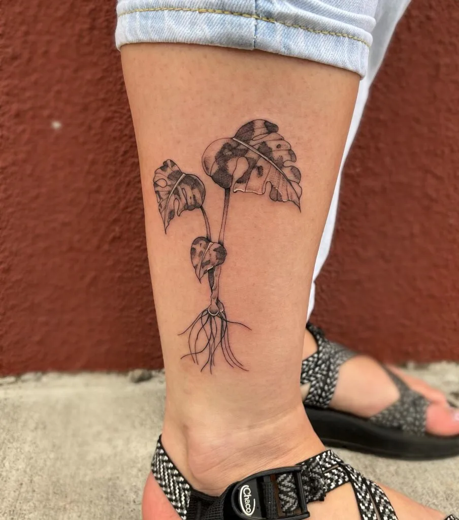 Depicting a houseplant with leaves stretching upward and roots flowing downward, this tattoo symbolizes growth, grounding, and the unseen strength beneath the surface. The realistic yet fine-line detailing highlights the veins of the leaves and the delicate structure of the roots.