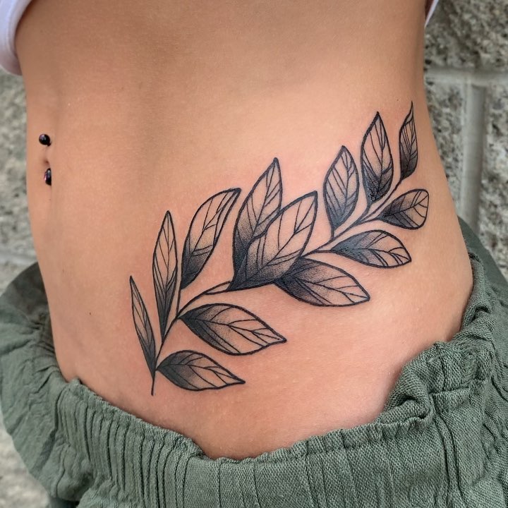 This tattoo features a beautifully detailed branch of leaves flowing naturally across the skin. The shading adds depth and dimension, making each leaf appear alive with texture. Its placement along the side of the torso enhances the body’s natural lines, creating a graceful movement that feels organic and fluid.