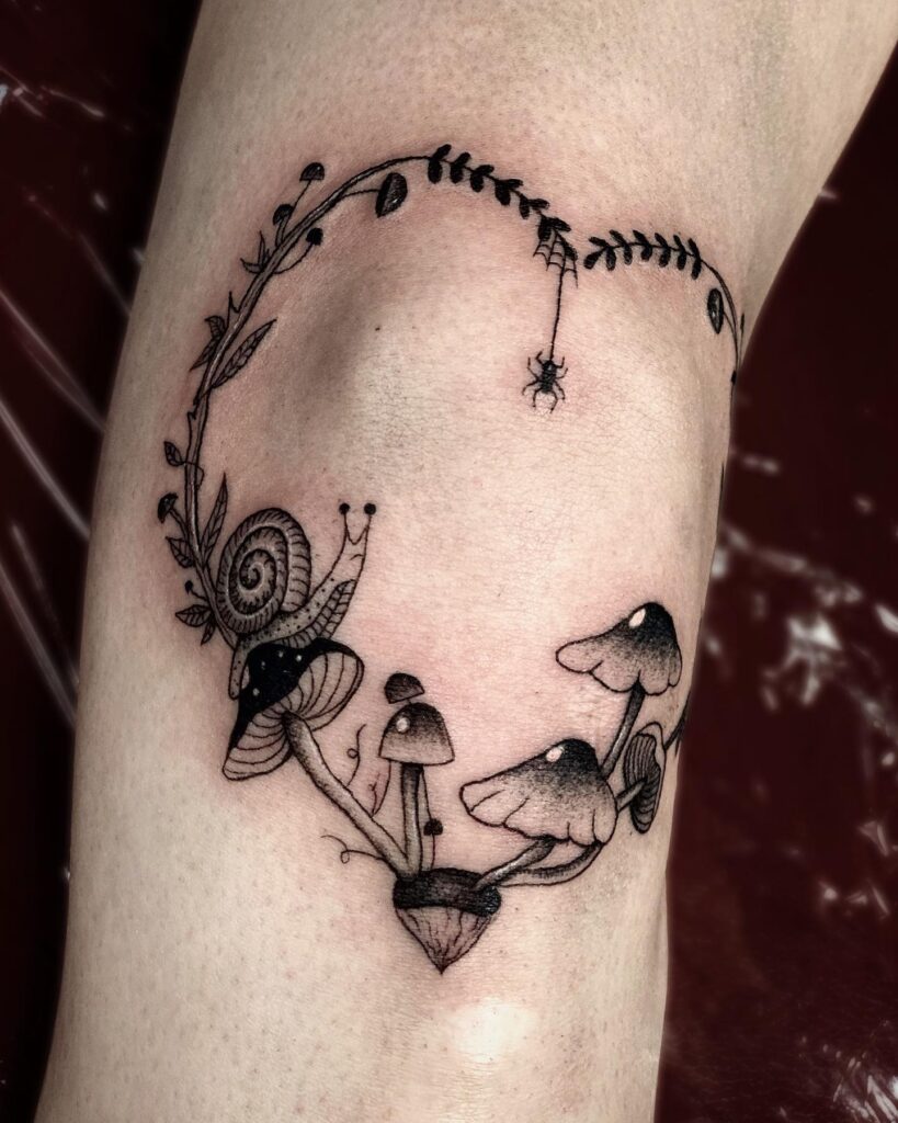 Whimsical and enchanting, this tattoo forms a natural wreath encircling the knee, created from mushrooms, vines, a snail, and even a tiny spider hanging from a web. The playful details capture the essence of woodland magic, where every creature and plant has its role in the ecosystem.