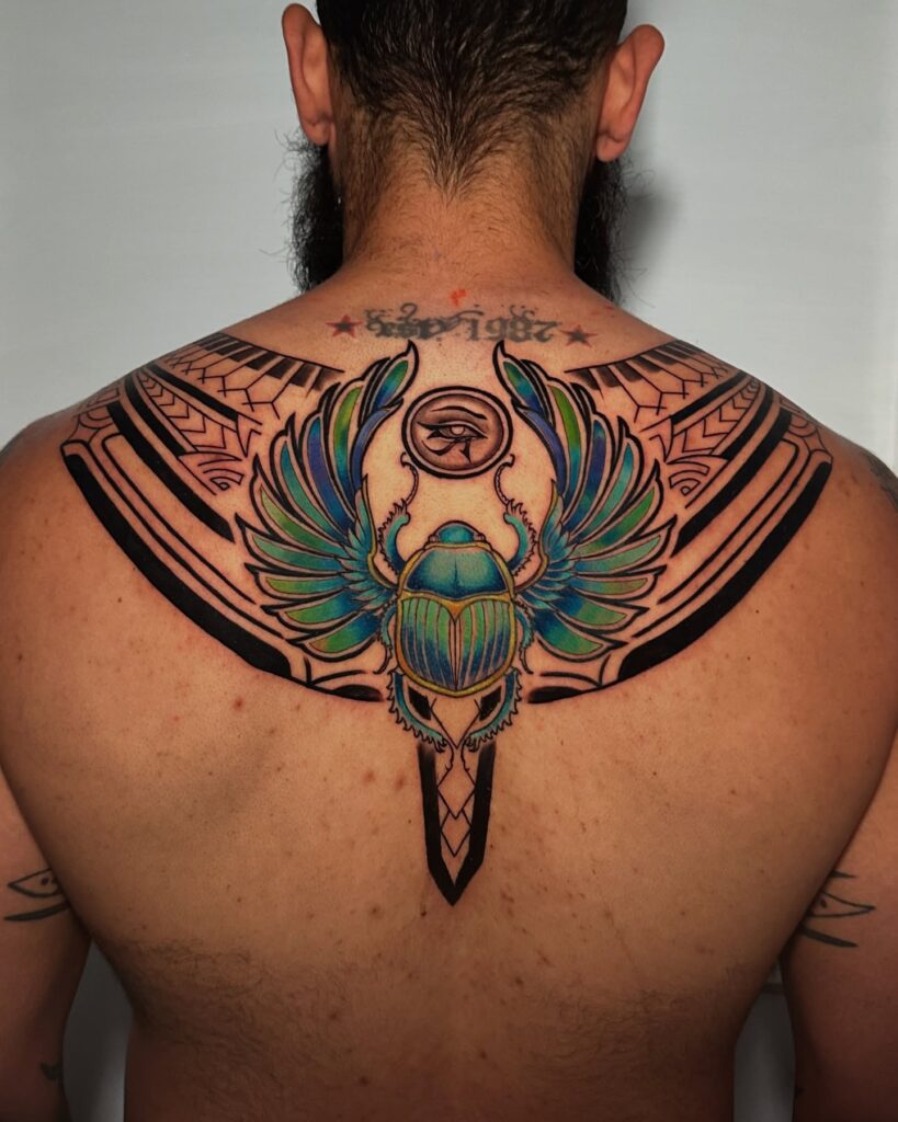 This back tattoo draws inspiration from ancient Egyptian symbolism, featuring a colorful scarab beetle with extended wings, adorned with intricate geometric detailing. Vibrant shades of green and blue contrast against bold black lines, creating a powerful centerpiece across the shoulders.