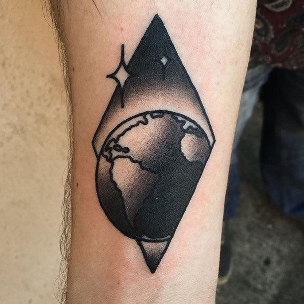 This tattoo places Earth at the center, framed by delicate stars and cosmic details around the upper arm. The circular shape gives it a planetary glow, while the shading captures depth and dimension of the continents.