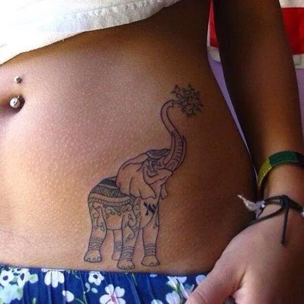 This delicate side stomach tattoo features a beautifully patterned elephant, incorporating mandala-inspired elements that enhance its symbolic meaning of wisdom and spiritual guidance. The elephant’s raised trunk adds an extra layer of good luck and positivity to the design.
