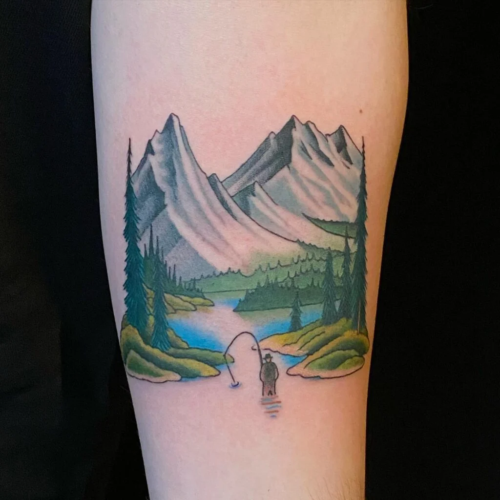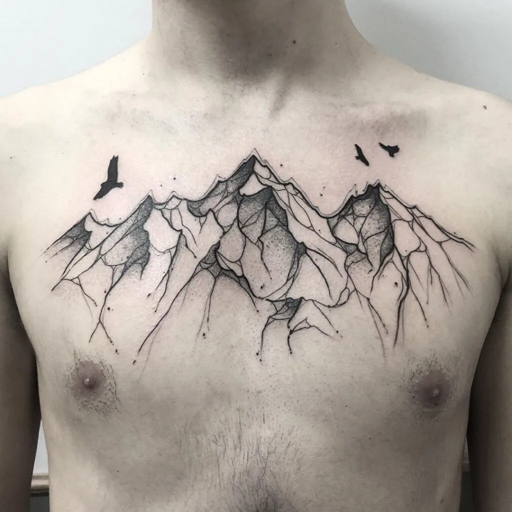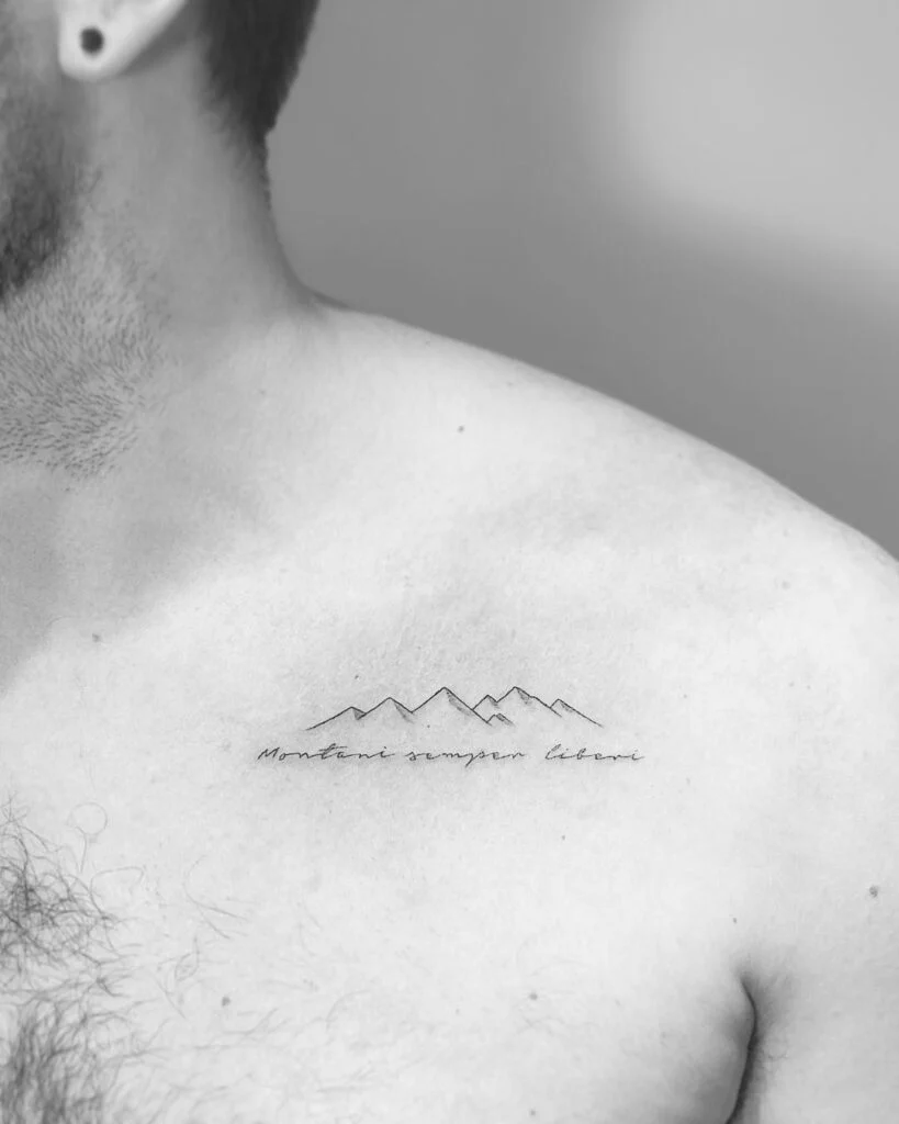 Mountain tattoos use minimalist lines to represent mountain ranges or peaks. These designs often focus on the striking outline of mountains.