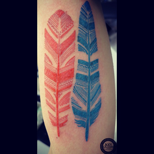 This unique tattoo features two parallel feathers, one red and one blue, with intricate tribal-inspired patterns inside. The bold colors make them stand out as a statement piece.