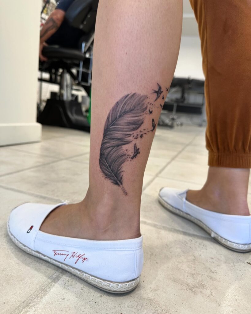 This leg tattoo features a large feather that transforms into birds and butterflies, giving a sense of motion and release. The shading is soft and detailed, creating a very natural look.