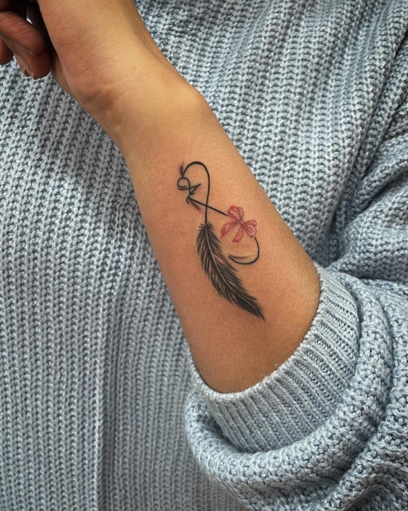 This charming design merges a fine black infinity line with a delicate feather and a small pink bow. The mix of black and color adds a playful yet meaningful touch.
