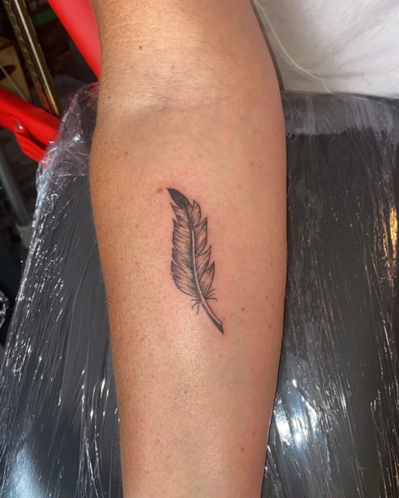 This sleek, black feather tattoo runs along the forearm with soft, natural shading that enhances its realistic look. The light and dark gradients give it depth, making the feather appear soft and weightless.