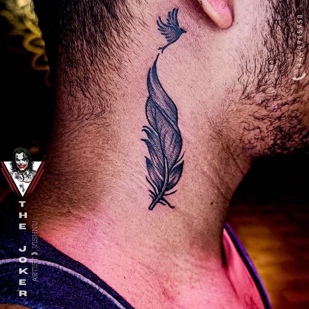 This neck tattoo combines a single feather with a flying bird breaking away at the tip, symbolizing release, freedom, and transformation. The bold black ink contrasts beautifully with the skin, making it stand out.