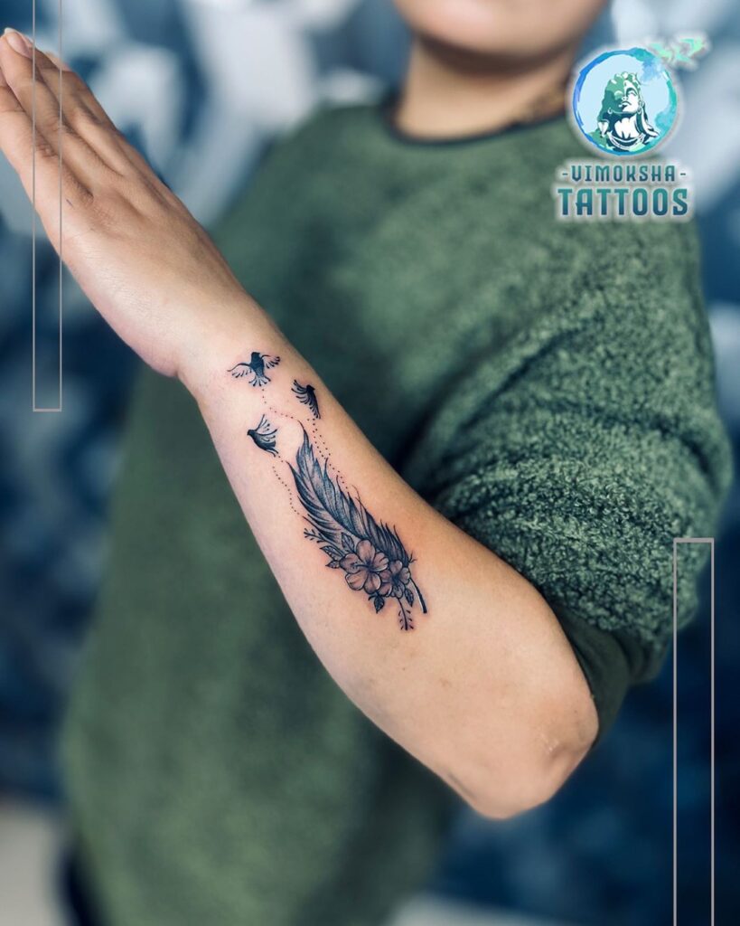 This beautiful forearm tattoo combines a detailed feather with small flowers and birds in flight. The dotted detailing gives it a soft, dreamy touch, making it feel like a poetic piece.
