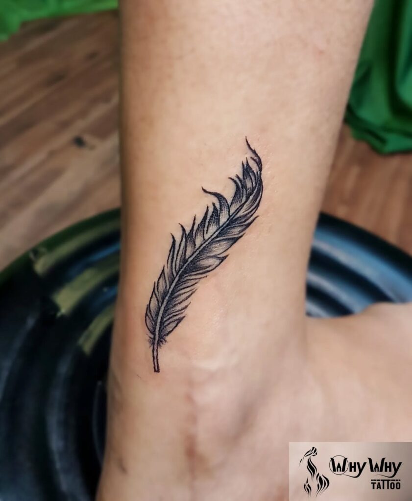This simple ankle tattoo uses soft shading and fine lines to create a delicate, airy feather. Its minimal design makes it perfect for someone looking for a subtle, elegant piece.