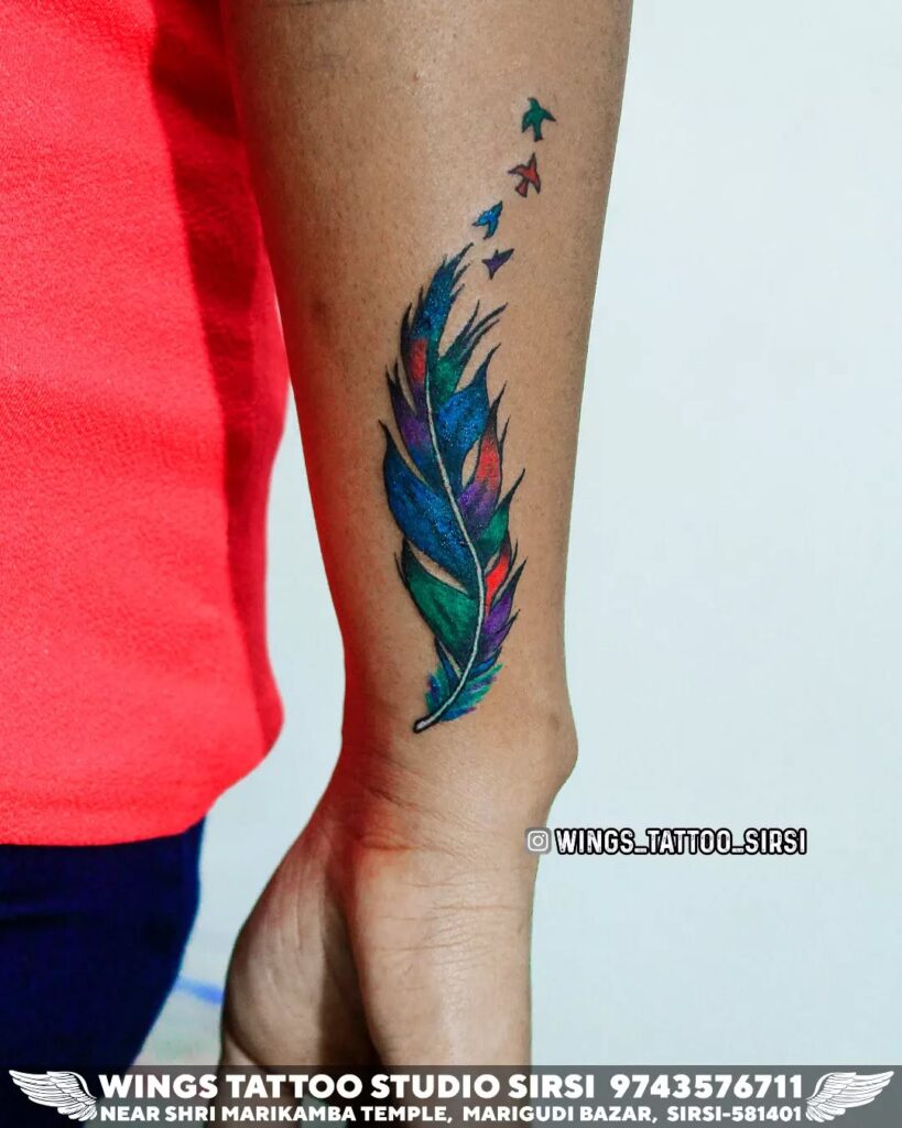 This forearm tattoo bursts with vibrant shades of blue, red, and green, turning the feather into a lively piece of art. The birds flying away from the tip represent release, hope, and new beginnings.