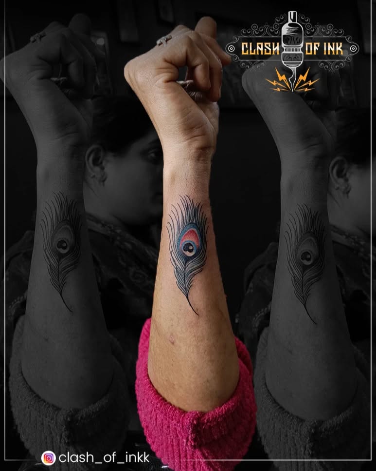 This delicate peacock feather tattoo on the wrist captures elegance and grace with its fine detailing and vibrant eye pattern. The combination of blue and green tones brings a soft pop of color, symbolizing beauty, renewal, and spiritual awakening.