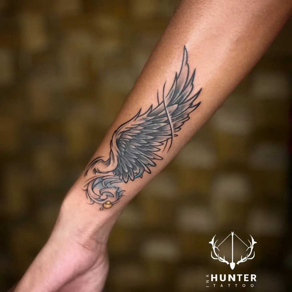 This bold forearm tattoo features an open, flowing wing that merges with feather-like strokes, creating movement and energy. The detailed linework and soft shading give it a dynamic look, as if the wing is mid-flight.