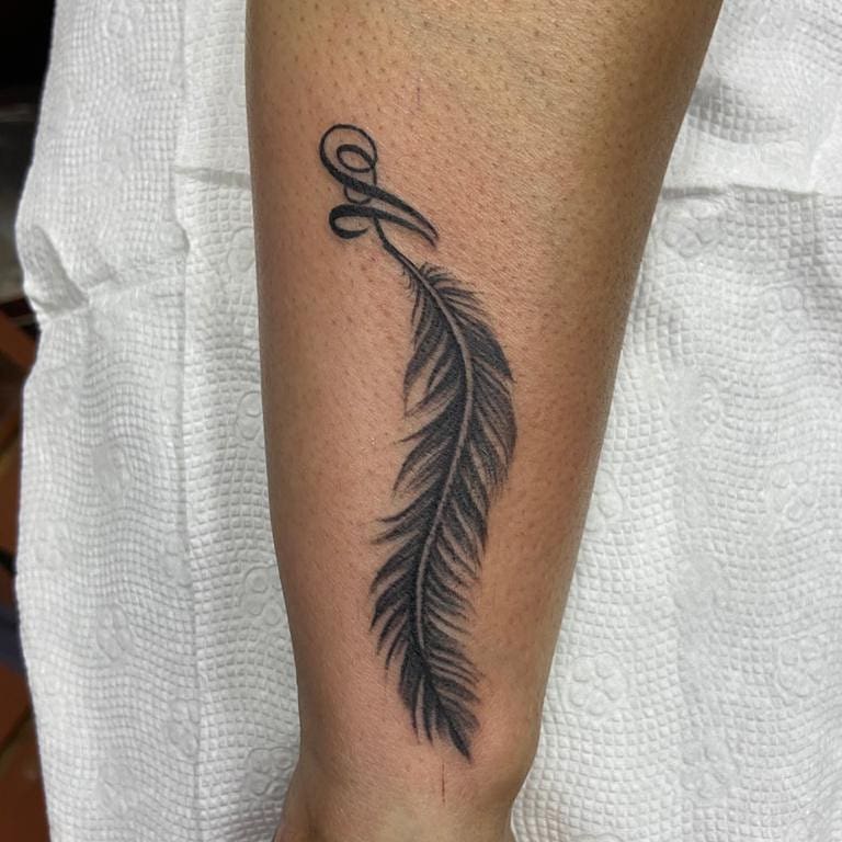 This sleek, black feather tattoo runs along the forearm with soft, natural shading that enhances its realistic look. The light and dark gradients give it depth, making the feather appear soft and weightless.