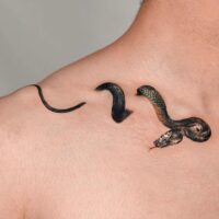 This unique tattoo features two intertwining feathers, merging into a snake’s head at the bottom. The dark shading and realistic details make the design bold and powerful.