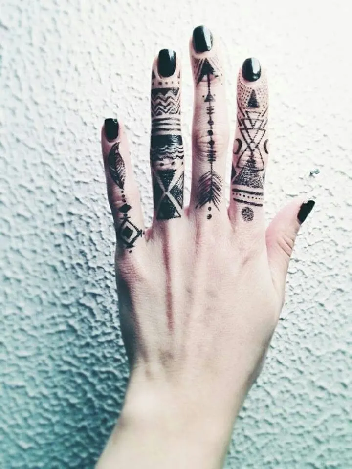 Tribal designs on the fingers are typically bold, with thick black lines and geometric shapes, but they can also be more intricate with smaller detailing. This tattoo style is ideal for individuals who want a tattoo that blends tradition with modern style, making a strong personal statement.
