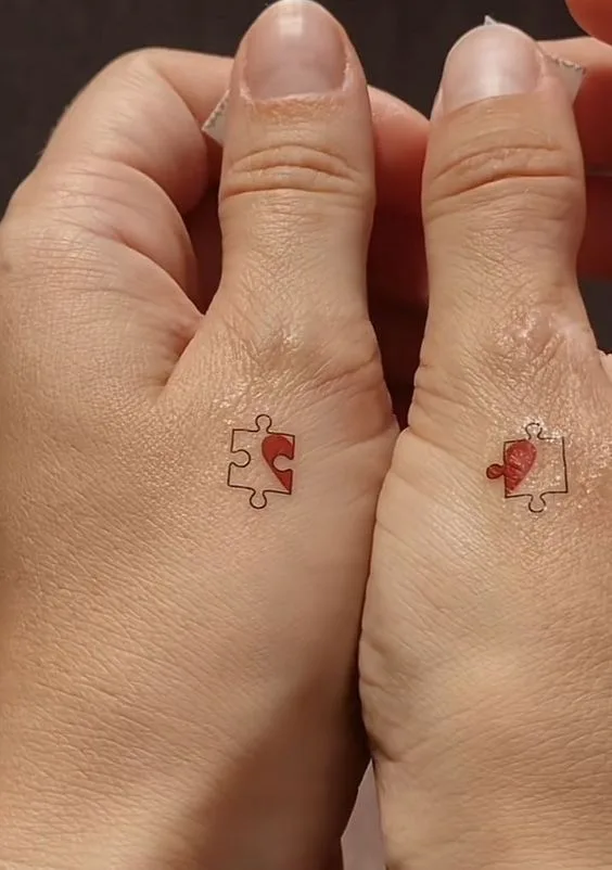 Puzzle piece tattoos are commonly used to represent connection, unity, and completeness. These tattoos can be placed on the fingers as a way to symbolize a bond between two people, such as couples or family members.
