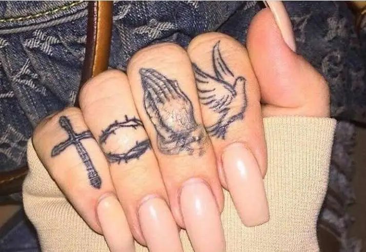 Religious symbols, such as crosses, the Om symbol, or the Hamsa hand, are deeply meaningful tattoos that can carry personal spiritual significance. Finger tattoos of religious symbols are subtle ways to incorporate faith into daily life. A cross, for example, can symbolize Christianity and the wearer’s commitment to their faith, while the Om symbol is linked to Hinduism and represents the universe’s divine sound.