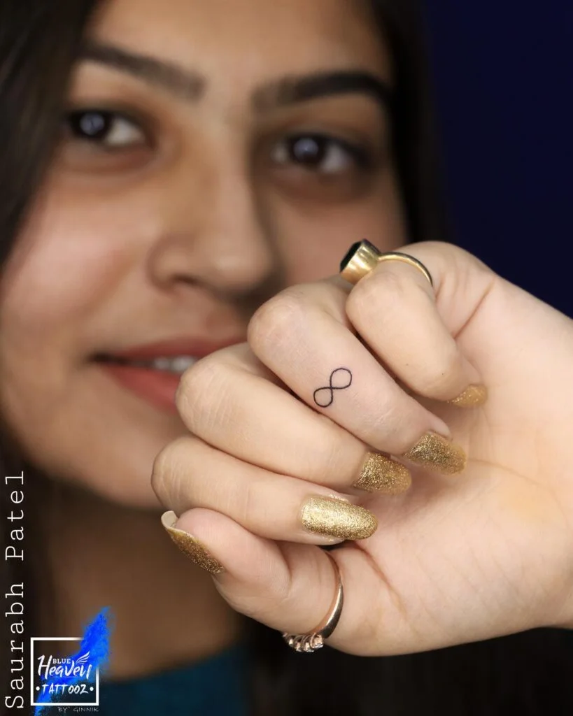 A tiny infinity symbol tattooed on the side of the finger captures the essence of eternal love, endless possibilities, and infinite strength. Despite its small size, this minimalist design carries powerful meaning, making it a popular choice for couples, best friends, or anyone who values the concept of forever.