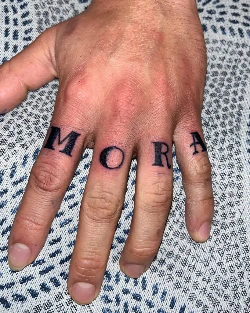 This tattoo spells out a word across the fingers in bold, serif-style letters. Each letter sits squarely on a knuckle, making the design stand out with strength and clarity. Word tattoos on fingers are timeless expressions of identity, values, or personal mottos.