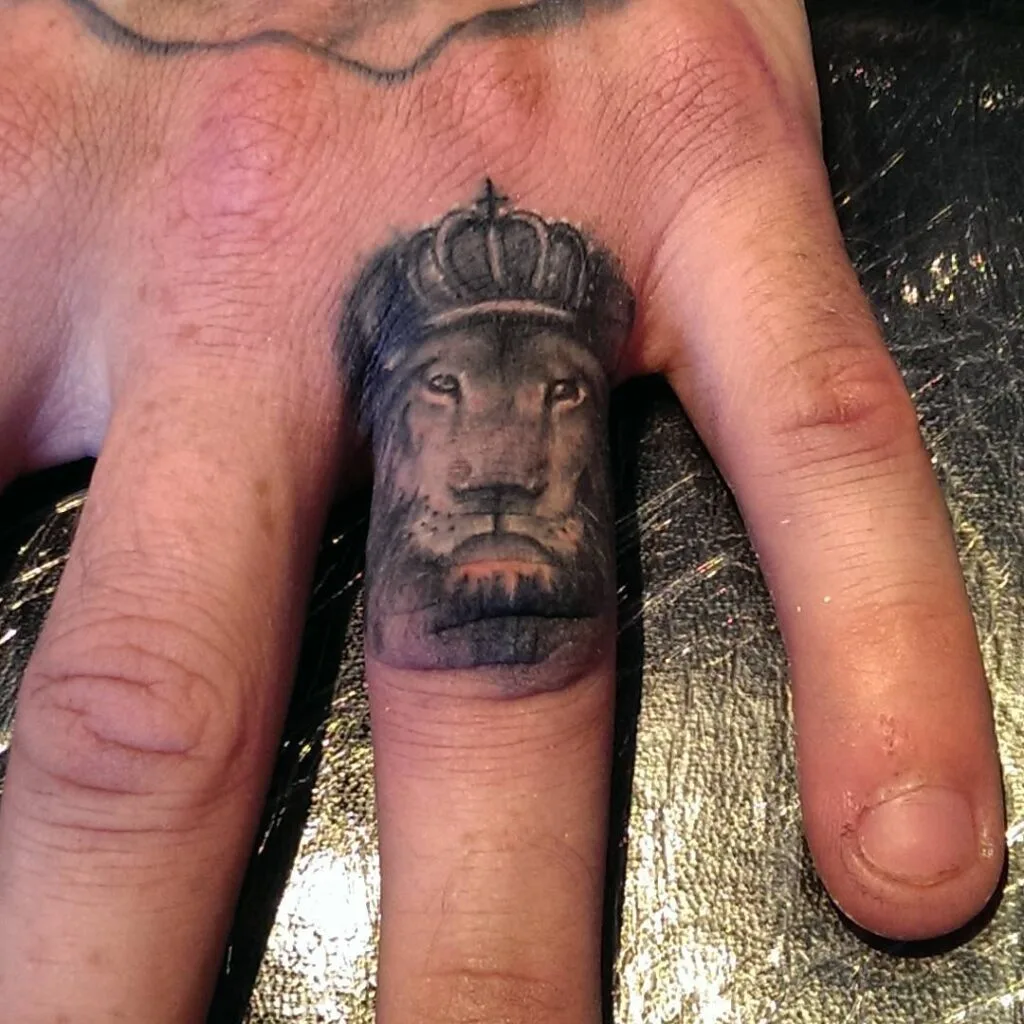 The crown emphasizes authority and resilience, reminding the wearer to embody confidence and remain steadfast through challenges. Finger tattoos are often bold statements, and this lion design is ideal for someone who wants to carry the symbolism of bravery and dominance at their fingertips—literally a crown of personal triumph and dignity.