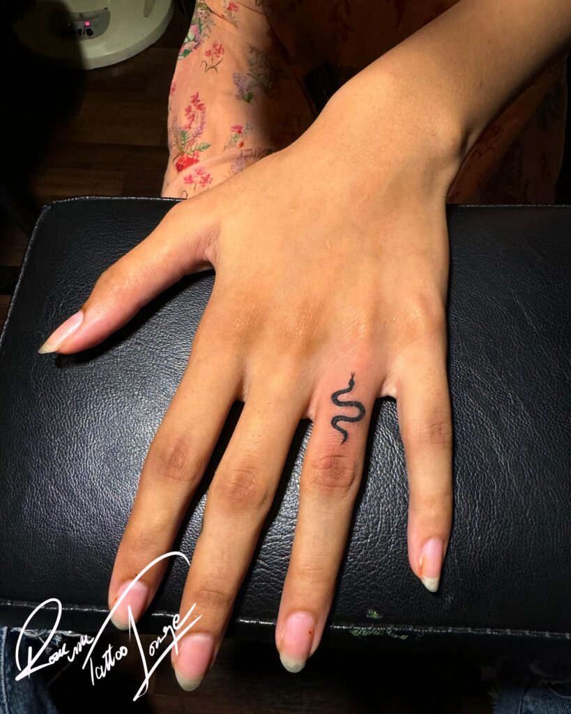 A sleek black snake design wraps along the finger, embodying transformation, rebirth, and hidden strength. Snakes are often associated with wisdom and adaptability, shedding their skin to symbolize growth and renewal. The tattoo’s placement enhances the finger’s natural curves, creating a flowing and dynamic look despite its minimal design.