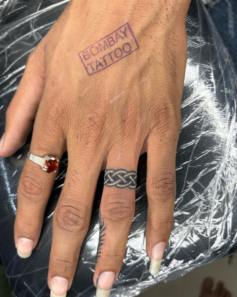 Unlike jewelry, this tattoo cannot be removed, making it a permanent and meaningful statement of commitment, whether to oneself or a loved one. Its placement on the finger emphasizes devotion and strength, while the detailed shading adds dimension and authenticity to the design. It’s a timeless piece for those who want an ornamental tattoo that blends art with symbolism.