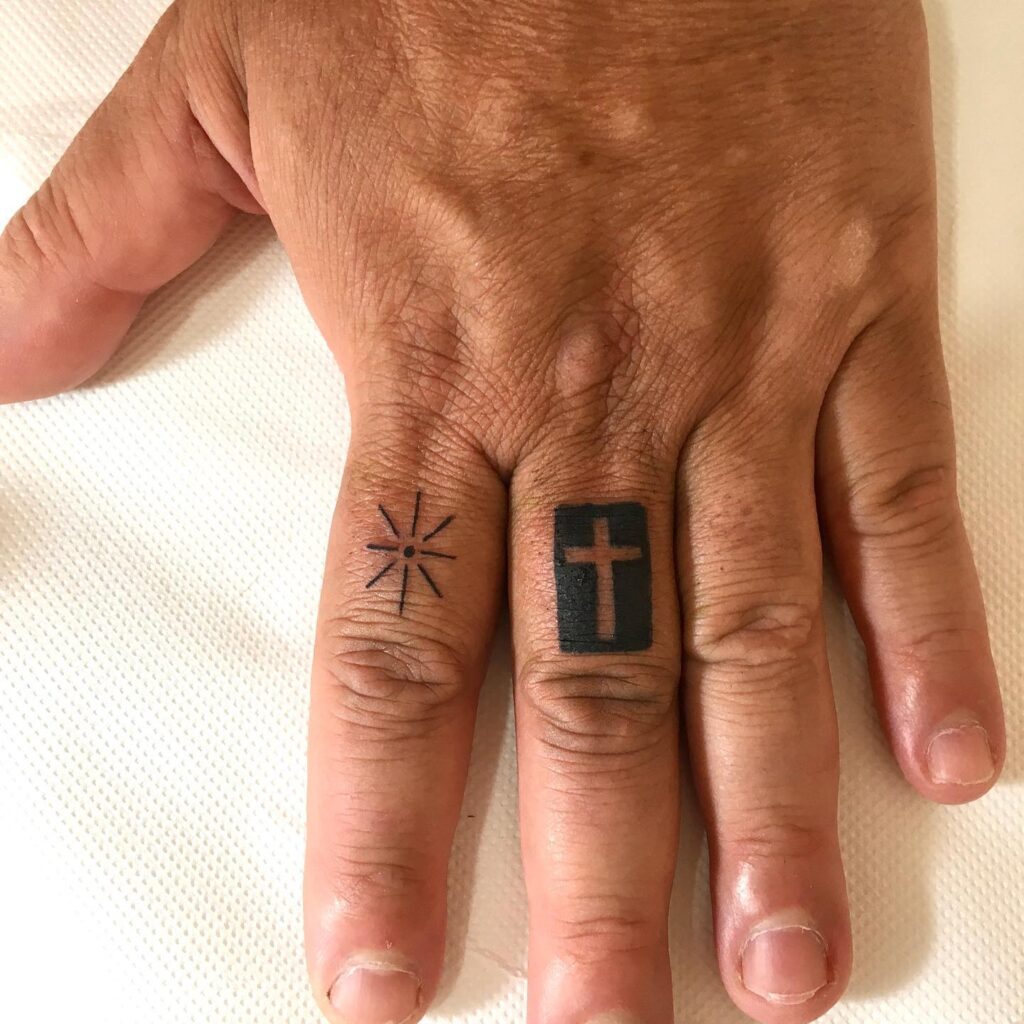 Together, they balance simplicity with profound symbolism, creating a deeply personal yet understated tattoo. Positioned on the fingers, these symbols act as daily reminders of belief and inner strength. This style is perfect for those who value clean lines and powerful meaning, showcasing that even small tattoos can carry immense spiritual weight and serve as anchors in life’s journey.