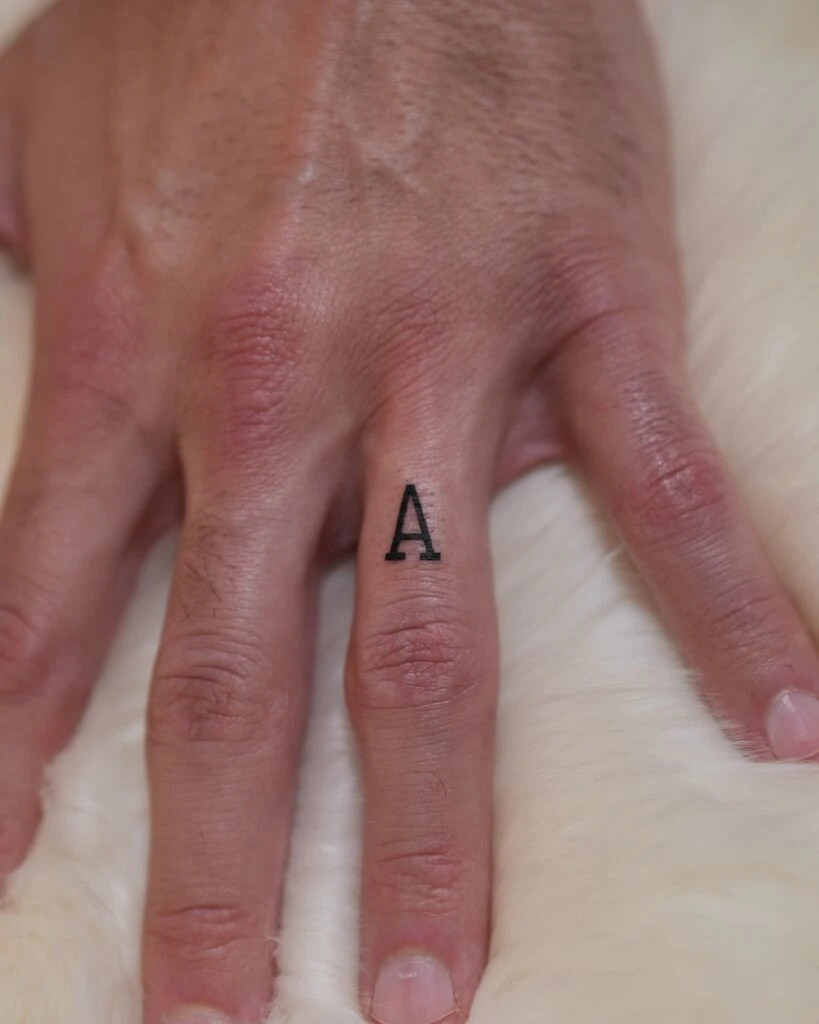 This tattoo showcases a bold letter “A” on the finger, simple yet striking in its design. Single-letter tattoos often symbolize something deeply personal—a loved one’s initial, one’s own identity, or a cherished word that starts with that letter.