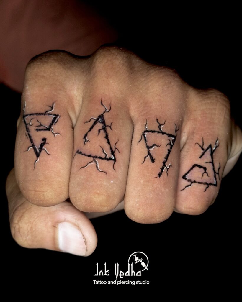 This striking tattoo design features cracked rune-like symbols across the knuckles, giving the appearance of lightning or breaking stone. The jagged lines and fractured effect create a dramatic, powerful look, symbolizing raw energy, resilience, and the strength to withstand life’s challenges.