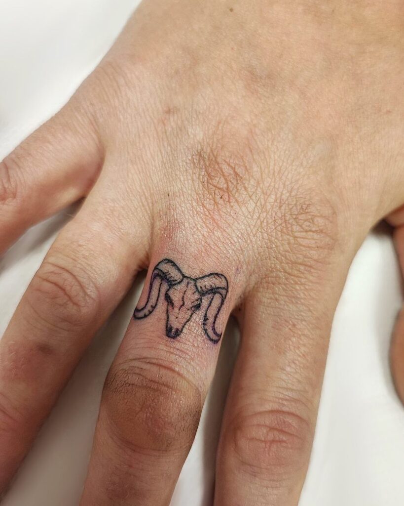 The curved horns bring a visually striking detail, giving the tattoo a balanced mix of natural beauty and raw power. Finger tattoos are intimate and constantly visible, making this design a fierce reminder of endurance and fearlessness. It’s the perfect tattoo for those who want to embrace their inner strength with a rugged and meaningful design.
