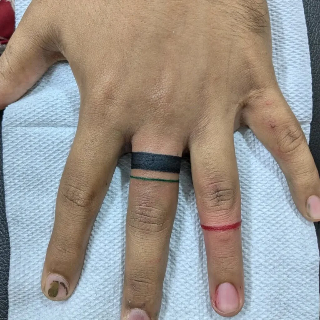This design features bold black, green, and red bands tattooed around the fingers, resembling permanent rings. The contrasting colors create a striking and modern look, while the circular form represents commitment, unity, and continuity.