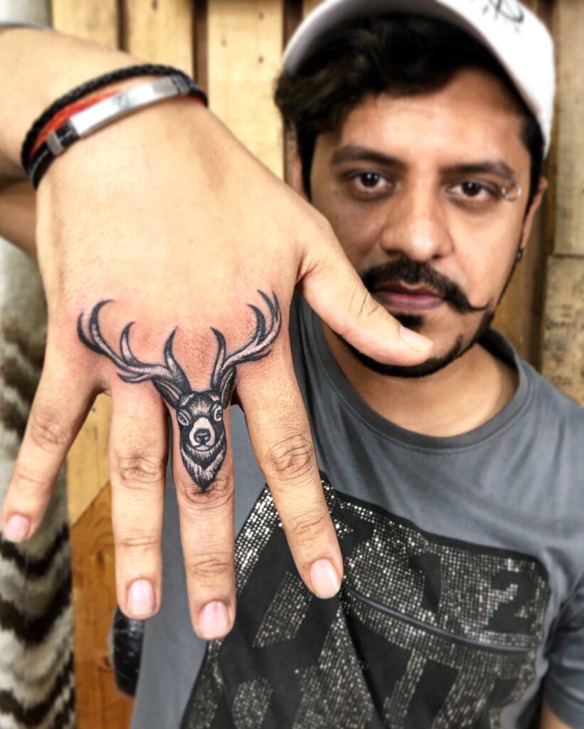 A detailed deer head with antlers inked on the finger captures the spirit of nature, grace, and strength. The deer is often seen as a symbol of gentleness balanced with resilience, while the antlers represent growth and regeneration. Placed prominently on the finger, this tattoo serves as a powerful reminder of the harmony between vulnerability and courage.