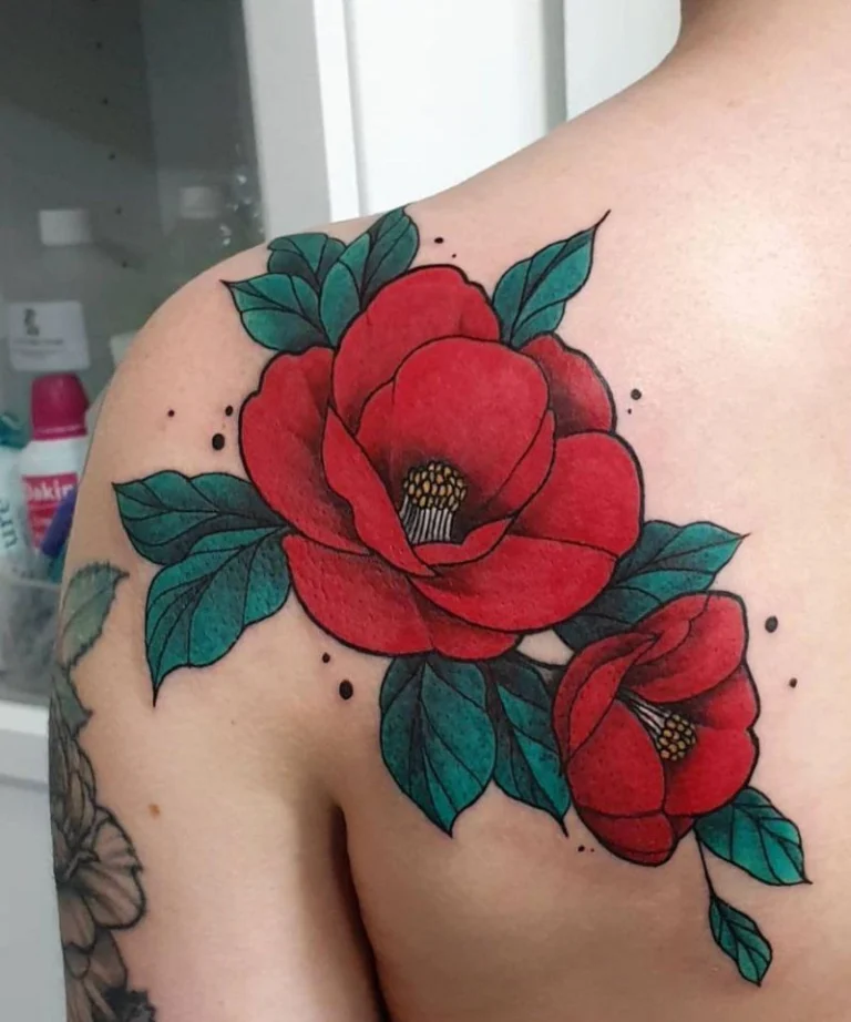 Camellia tattoos represent love, admiration, and perfection. Often associated with elegance and refinement, camellias are popular in Asian cultures, symbolizing devotion and longevity. Their layered petals and vibrant colors, such as red, pink, or white, create stunning and intricate tattoo designs.