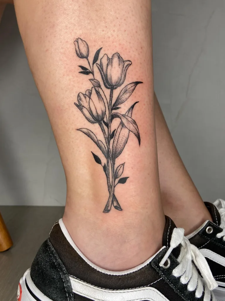 Tulip tattoos symbolize love, rebirth, and elegance. Their sleek, cup-shaped blooms and vibrant colors make tulips a beautiful choice for floral tattoos. Tulip designs can be rendered in bold traditional styles or soft watercolor techniques, with colors like red for love, yellow for cheerfulness, and purple for royalty.
