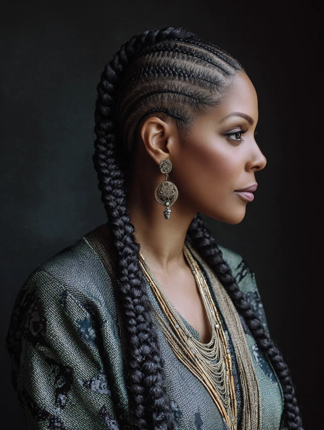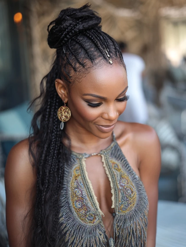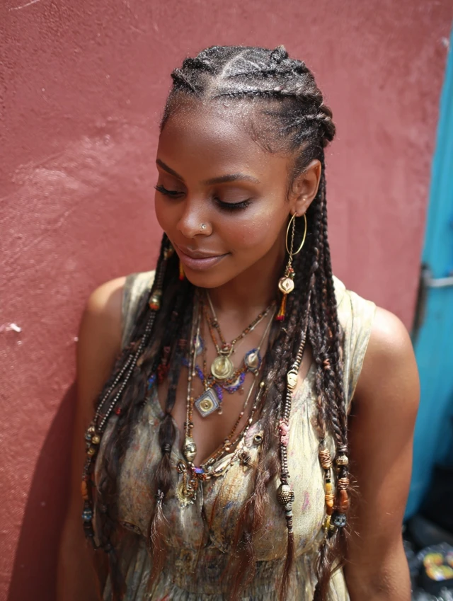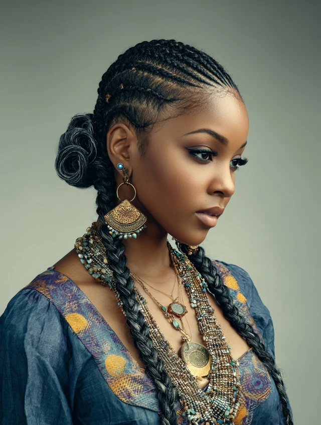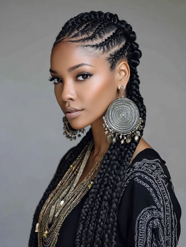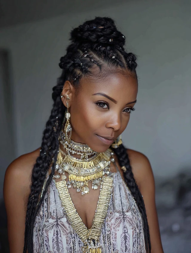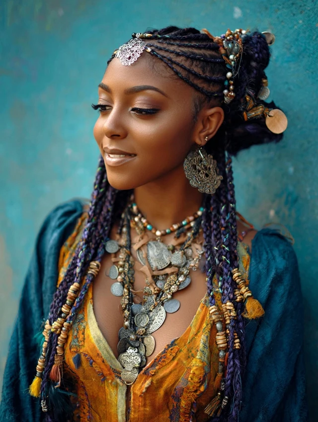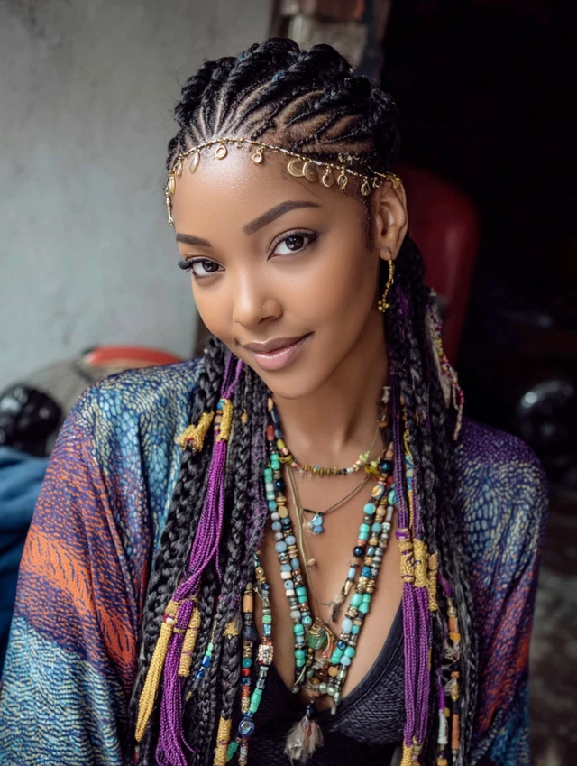 Accessories and color elevate the style while highlighting the intricate braid patterns.